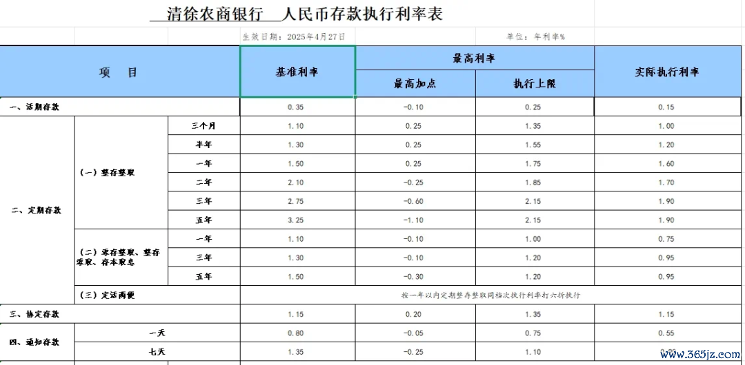 4月27日,清徐农商银行发布人民币存款执行利率调整公告,调整后3个月期、6个月期、1年期、2年期、3年期、5年期整存整取存款实际执行利率分别为1%、1.2%、1.6%、1.7%、1.9%、1.9%。