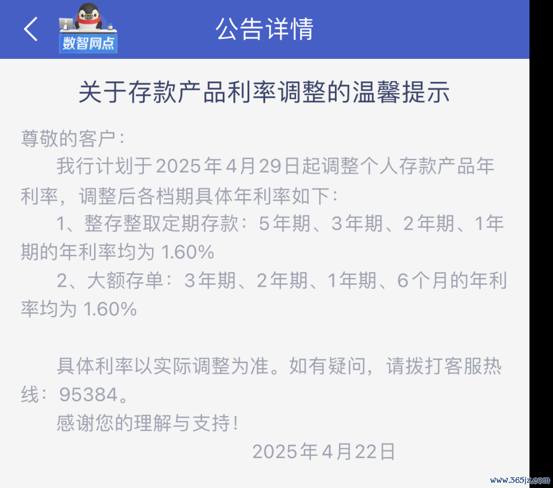 4月25日,德清农商银行发布公告称,自4月30日起调整人民币储蓄存款执行利率,相比该行3月公布的利率表,1年期、2年期、3年期、5年期整存整取定期储蓄存款利率分别下调5个、10个、10个、25个基点,至1.65%、1.7%、1.95%、1.8%。